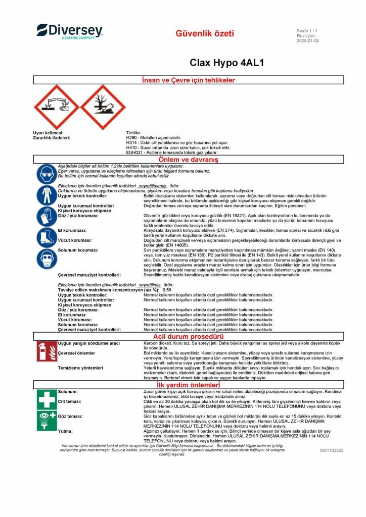 Diversey Clax Hypo 4AL1 Klorlu Ağartıcı 20 L MSDS Güvenlik Bilgi Formu ve Güvenlik Özeti