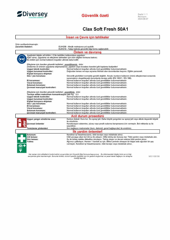 Diversey Clax Soft Fresh 50A1 Çamaşır Yumuşatıcı 20L MSDS Güvenlik Bilgi Formu ve Güvenlik Özeti