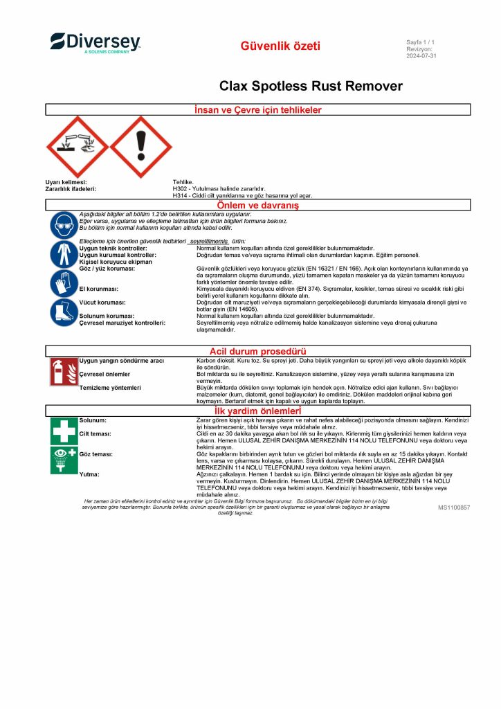 Diversey Clax Spotless Pas Çözücü 750 Ml MSDS Güvenlik Bilgi Formu ve Güvenlik Özeti