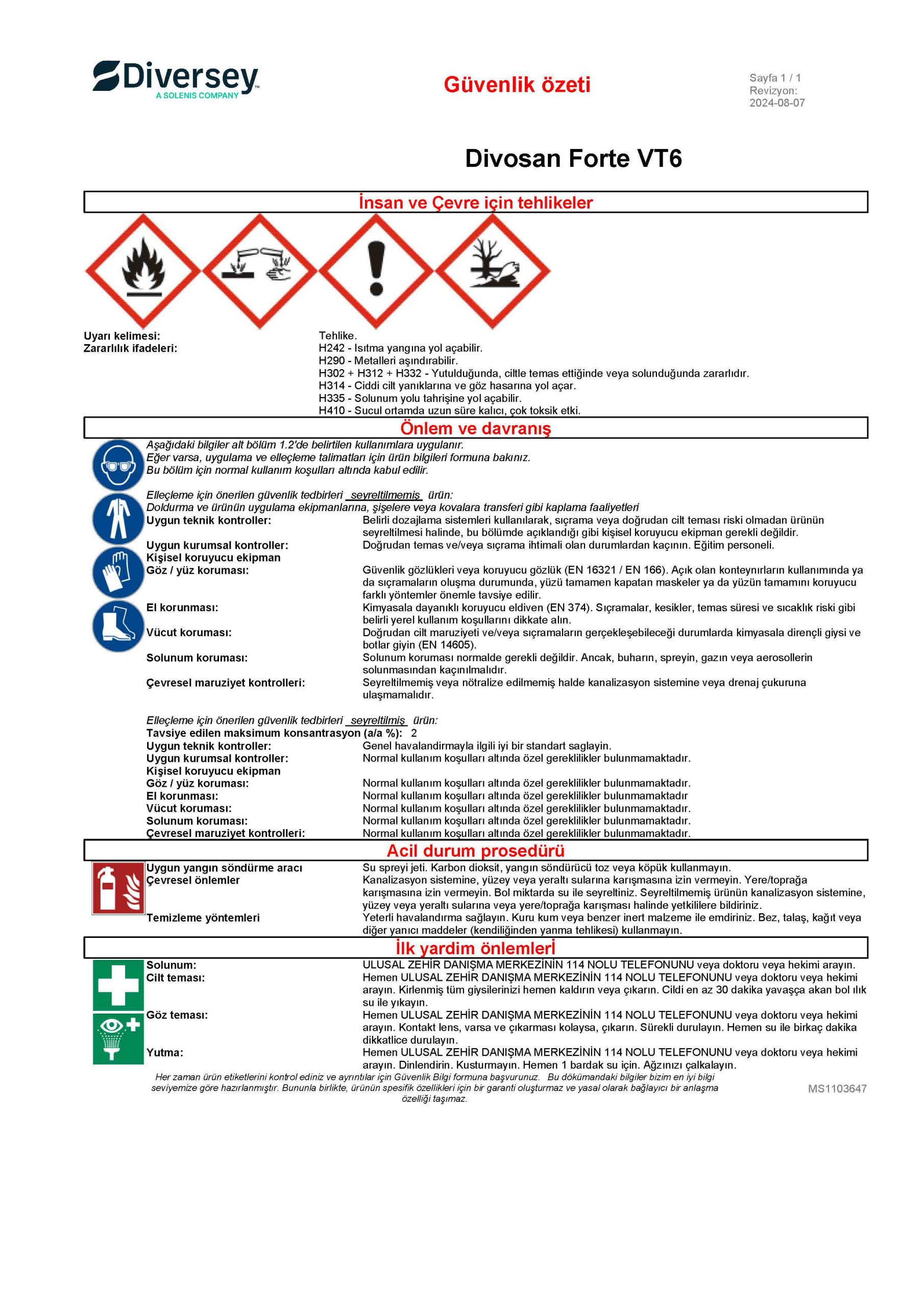 Ürün sipariş sayfasına geri dön DORİN STORE dorin.tr'ye geri dön Diversey Divosan Forte VT6 Perasetik Asit Bazlı Dezenfektan 20L MSDS Güvenlik Bilgi Formu ve Güvenlik Özeti Stok Kodu: 70023109 Güvenlik Özeti Ürün sipariş sayfasına geri dön