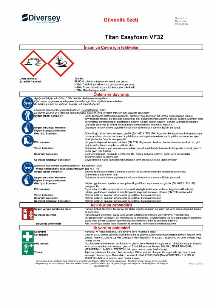 Ürün sipariş sayfasına geri dön DORİN STORE dorin.tr'ye geri dön Diversey Easyfoam VF32 20L MSDS Güvenlik Bilgi Formu ve Güvenlik Özeti Stok Kodu: 7522172 Güvenlik Özeti Ürün sipariş sayfasına geri dön