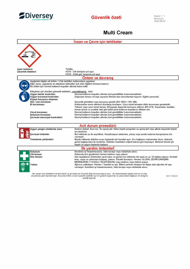 Ürün sipariş sayfasına geri dön DORİN STORE dorin.tr'ye geri dön Diversey Multi Cream Limon Kokulu Krem Temizleyici 500 Ml MSDS Güvenlik Bilgi Formu ve Güvenlik Özeti Stok Kodu: 70024174 Güvenlik Özeti Ürün sipariş sayfasına geri dön