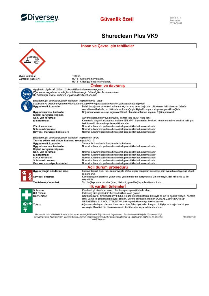 Ürün sipariş sayfasına geri dön DORİN STORE dorin.tr'ye geri dön Diversey Shureclean Plus VK9 Manuel Kullanıma Uygun Köpük Temizleyici 20L MSDS Güvenlik Bilgi Formu ve Güvenlik Özeti Stok Kodu: 7509292 Güvenlik Özeti Ürün sipariş sayfasına geri dön