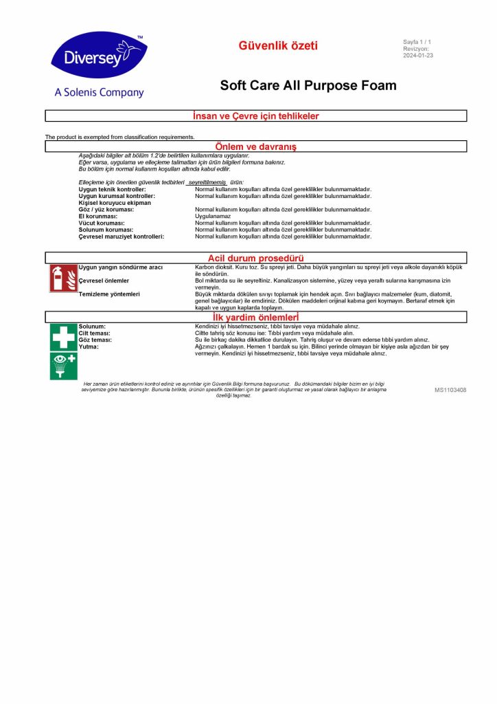 Ürün sipariş sayfasına geri dön DORİN STORE dorin.tr'ye geri dön Diversey Soft Care All Purpose Foam Kartuş Köpük Sabun 1,3L MSDS Güvenlik Bilgi Formu ve Güvenlik Özeti Stok Kodu: 70024363 Güvenlik Özeti Ürün sipariş sayfasına geri dön