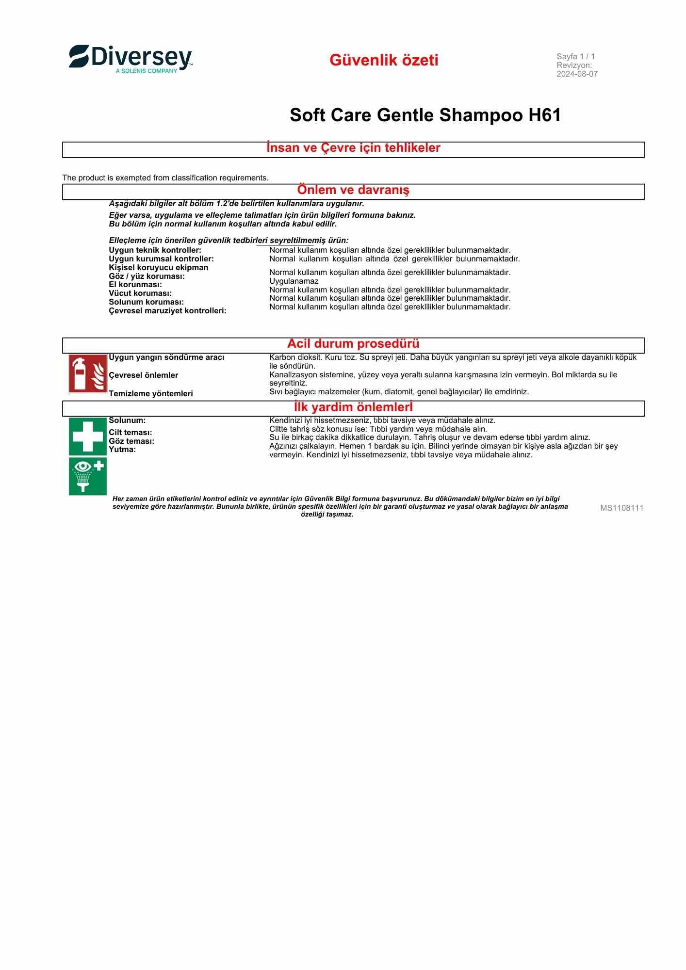 Ürün sipariş sayfasına geri dön DORİN STORE dorin.tr'ye geri dön Diversey Soft Care Gentle Shampoo H61 Şampuan 5L-5,15 Kg MSDS Güvenlik Bilgi Formu ve Güvenlik Özeti Stok Kodu: 70024115 Güvenlik Özeti Ürün sipariş sayfasına geri dön