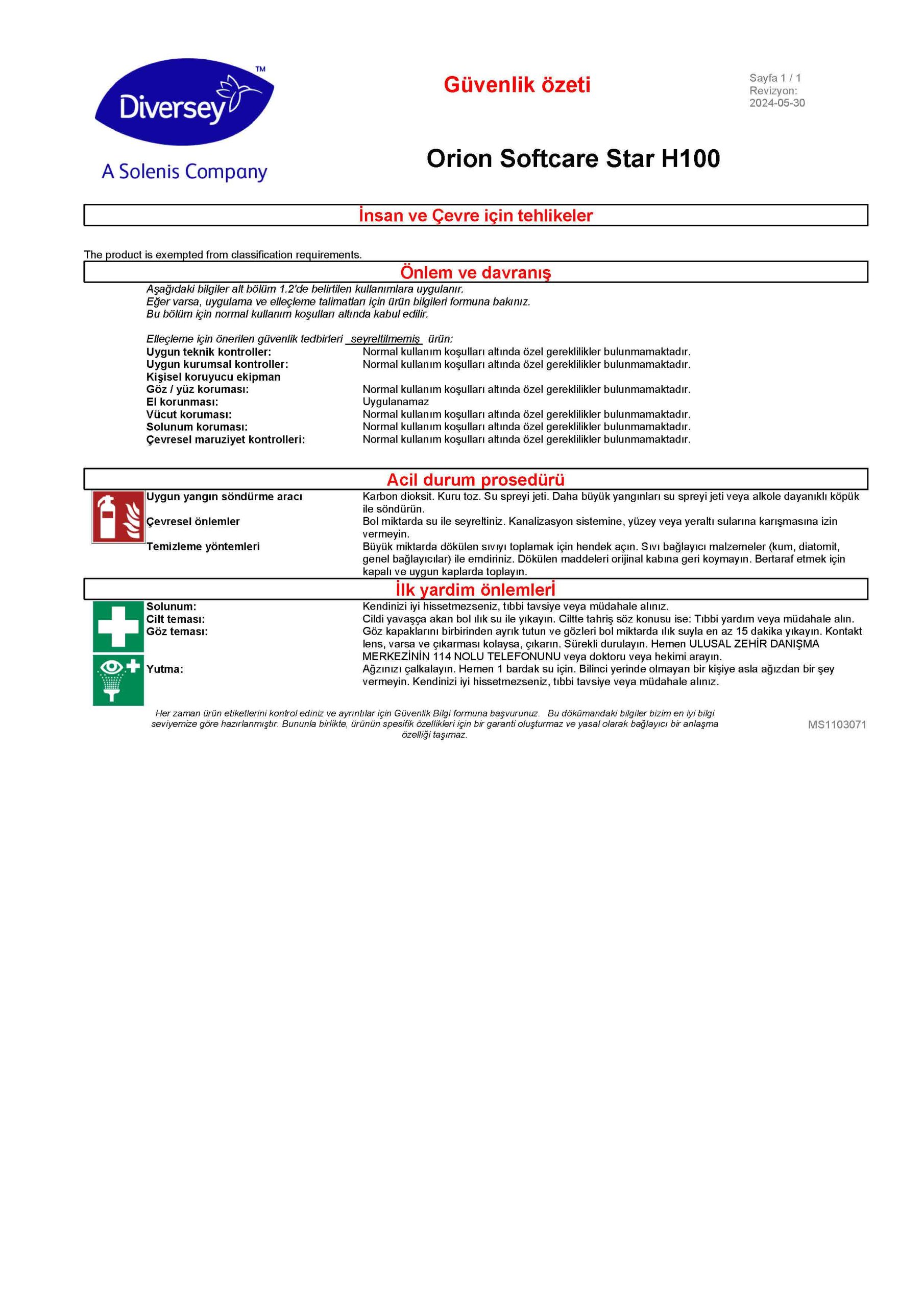 Ürün sipariş sayfasına geri dön DORİN STORE dorin.tr'ye geri dön Diversey Softcare Star H100 El Yıkama Sabunu 20 L MSDS Güvenlik Bilgi Formu ve Güvenlik Özeti Stok Kodu: 7511160 Güvenlik Özeti Ürün sipariş sayfasına geri dön