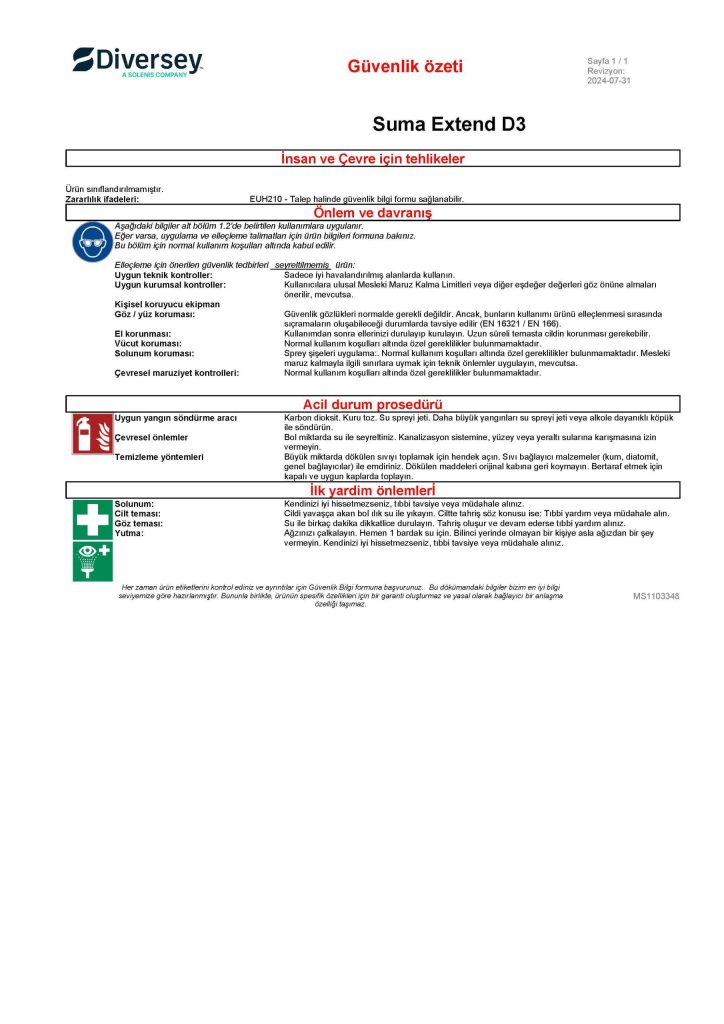 Ürün sipariş sayfasına geri dön DORİN STORE dorin.tr'ye geri dön Diversey Suma Extend D3 Ağır Yağ Çözücü 750 Ml MSDS Güvenlik Bilgi Formu ve Güvenlik Özeti Stok Kodu: 70024689 Güvenlik Özeti Ürün sipariş sayfasına geri dön