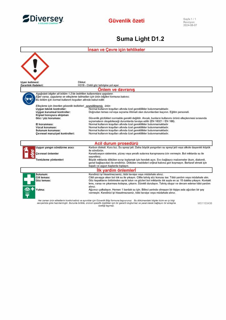 Ürün sipariş sayfasına geri dön DORİN STORE dorin.tr'ye geri dön Diversey Suma Light D1.2 Elde Bulaşık Yıkama Deterjanı 20 L MSDS Güvenlik Bilgi Formu ve Güvenlik Özeti Stok Kodu: 7010011 Güvenlik Özeti Ürün sipariş sayfasına geri dön