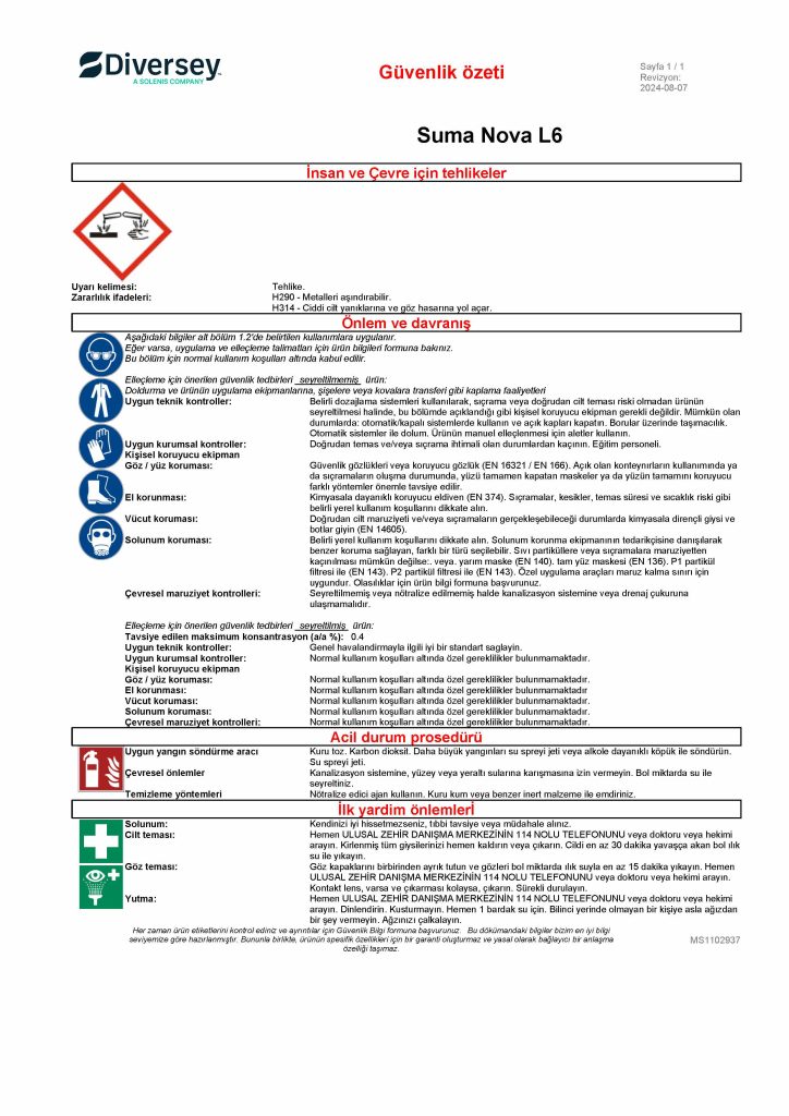 Ürün sipariş sayfasına geri dön DORİN STORE dorin.tr'ye geri dön Diversey Suma Nova L6 Bulaşık Makinesi Deterjanı 20 L MSDS Güvenlik Bilgi Formu ve Güvenlik Özeti Stok Kodu: 70009244 Güvenlik Özeti Ürün sipariş sayfasına geri dön