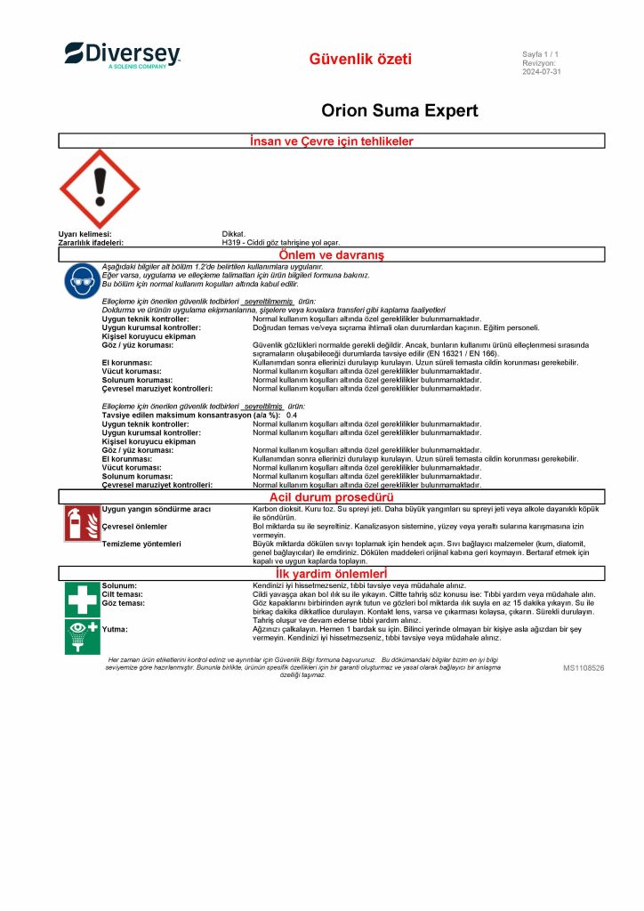 Diversey Suma Orion Expert Elle Bulaşık Yıkama Deterjanı 20 L MSDS Güvenlik Bilgi Formu ve Güvenlik Özeti