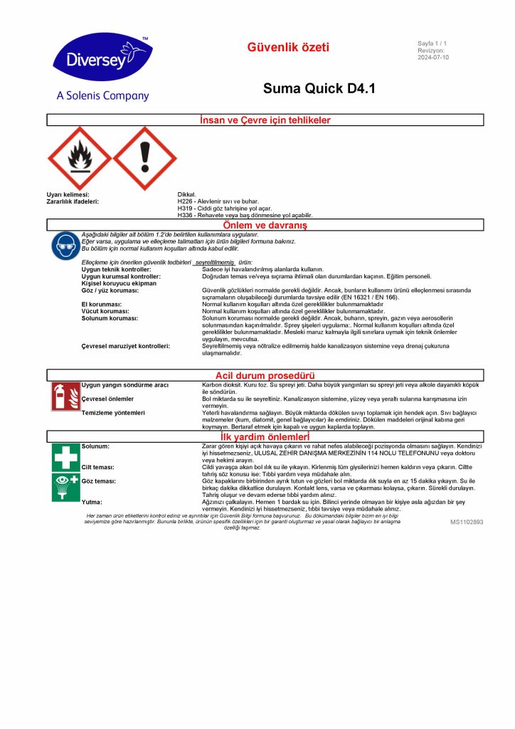 Ürün sipariş sayfasına geri dön DORİN STORE dorin.tr'ye geri dön Diversey Suma Quick D4.1 Alkol Bazlı Yüzey Temizleyici MSDS Güvenlik Bilgi Formu ve Güvenlik Özeti Stok Kodu: 7508252 Güvenlik Özeti Ürün sipariş sayfasına geri dön
