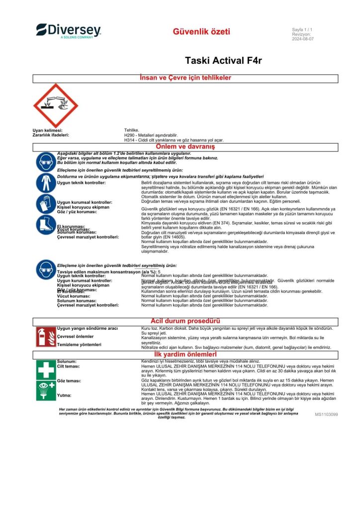 Ürün sipariş sayfasına geri dön DORİN STORE dorin.tr'ye geri dön Diversey Taski Actival Bitkisel ve Hayvansal Yağ Giderici F4r 5L/5,25 Kg MSDS Güvenlik Bilgi Formu ve Güvenlik Özeti Stok Kodu: 70024258 Güvenlik Özeti Ürün sipariş sayfasına geri dön
