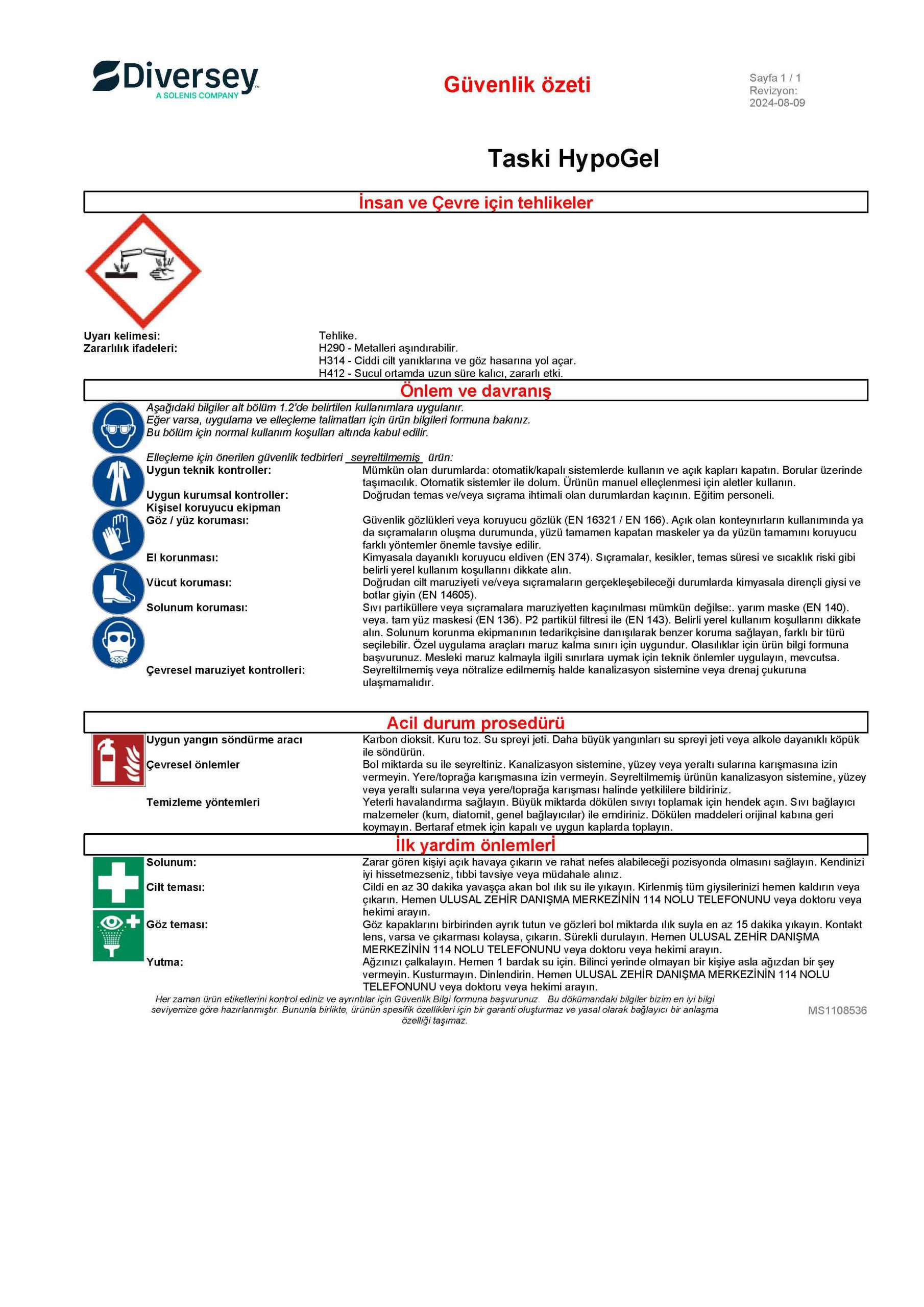 Ürün sipariş sayfasına geri dön DORİN STORE dorin.tr'ye geri dön Diversey Taski Hypogel Genel Amaçlı Yüzey Temizleyici 5L MSDS Güvenlik Bilgi Formu ve Güvenlik Özeti Stok Kodu: 70004294 Güvenlik Özeti Ürün sipariş sayfasına geri dön