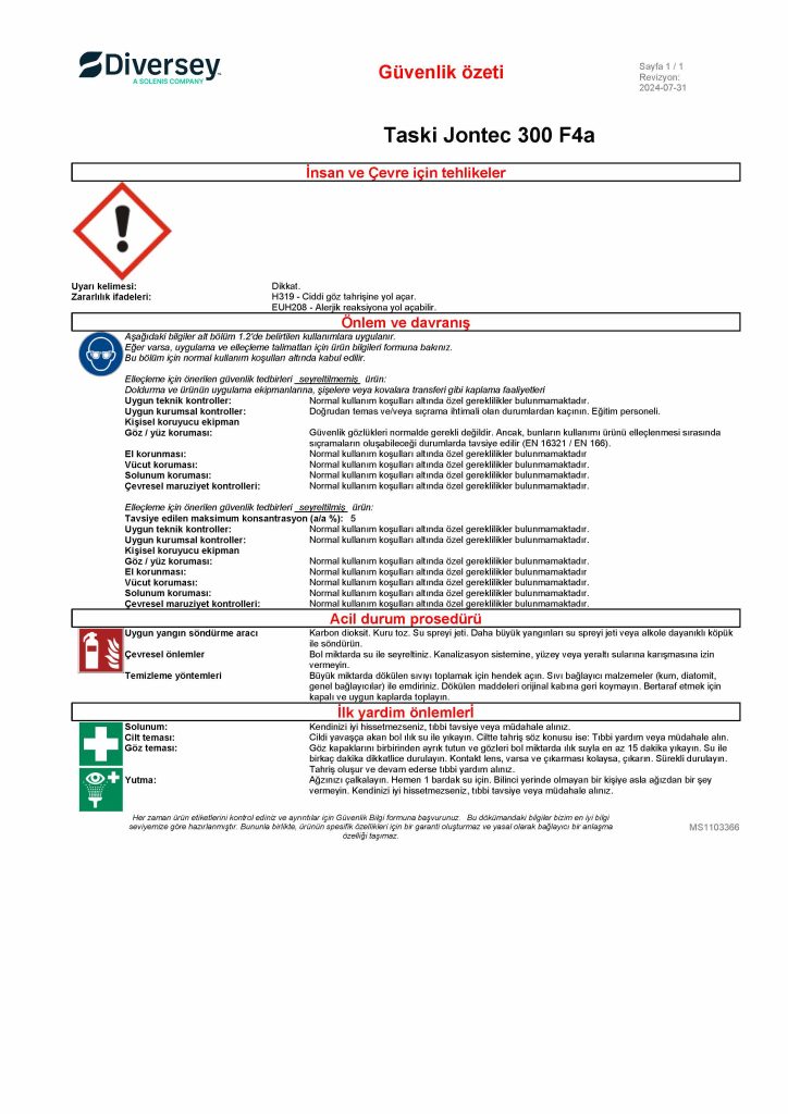 Ürün sipariş sayfasına geri dön DORİN STORE dorin.tr'ye geri dön Diversey Taski Jontec 300 F4A Nötral Zemin Temizlik Deterjanı 20 L MSDS Güvenlik Bilgi Formu ve Güvenlik Özeti Stok Kodu: 70024262 Güvenlik Özeti Ürün sipariş sayfasına geri dön