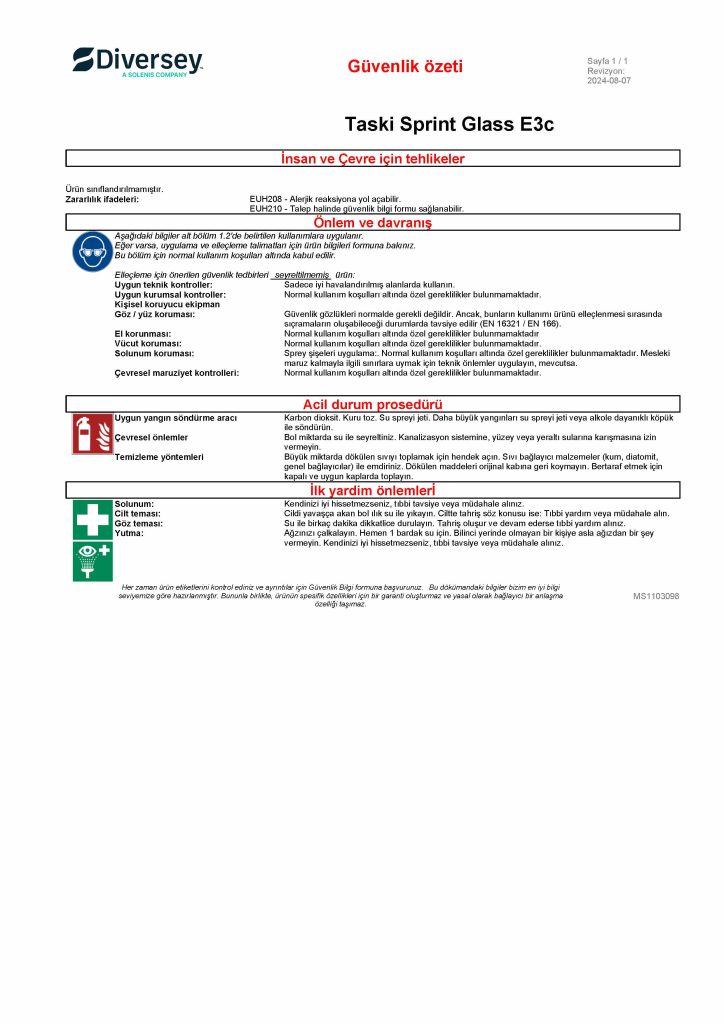 Ürün sipariş sayfasına geri dön DORİN STORE dorin.tr'ye geri dön Diversey Taski Sprint Glass E3C Cam ve Parlak Yüzey Temizleme Ürünü 20 L MSDS Güvenlik Bilgi Formu ve Güvenlik Özeti Stok Kodu: 70024265 Güvenlik Özeti Ürün sipariş sayfasına geri dön