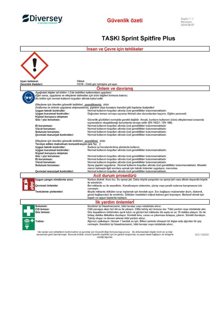 Ürün sipariş sayfasına geri dön DORİN STORE dorin.tr'ye geri dön Diversey Taski Sprint Spitfire Plus Genel Temizlik Ürünü 750 Ml MSDS Güvenlik Bilgi Formu ve Güvenlik Özeti Stok Kodu: 70024754 Güvenlik Özeti Ürün sipariş sayfasına geri dön