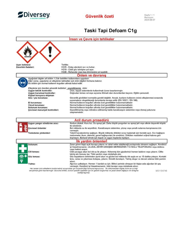 Ürün sipariş sayfasına geri dön DORİN STORE dorin.tr'ye geri dön Diversey Taski Tapi Defoam C1g Köpük Kesici Ürün 1L MSDS Güvenlik Bilgi Formu ve Güvenlik Özeti Stok Kodu: 7512368 Güvenlik Özeti Ürün sipariş sayfasına geri dön