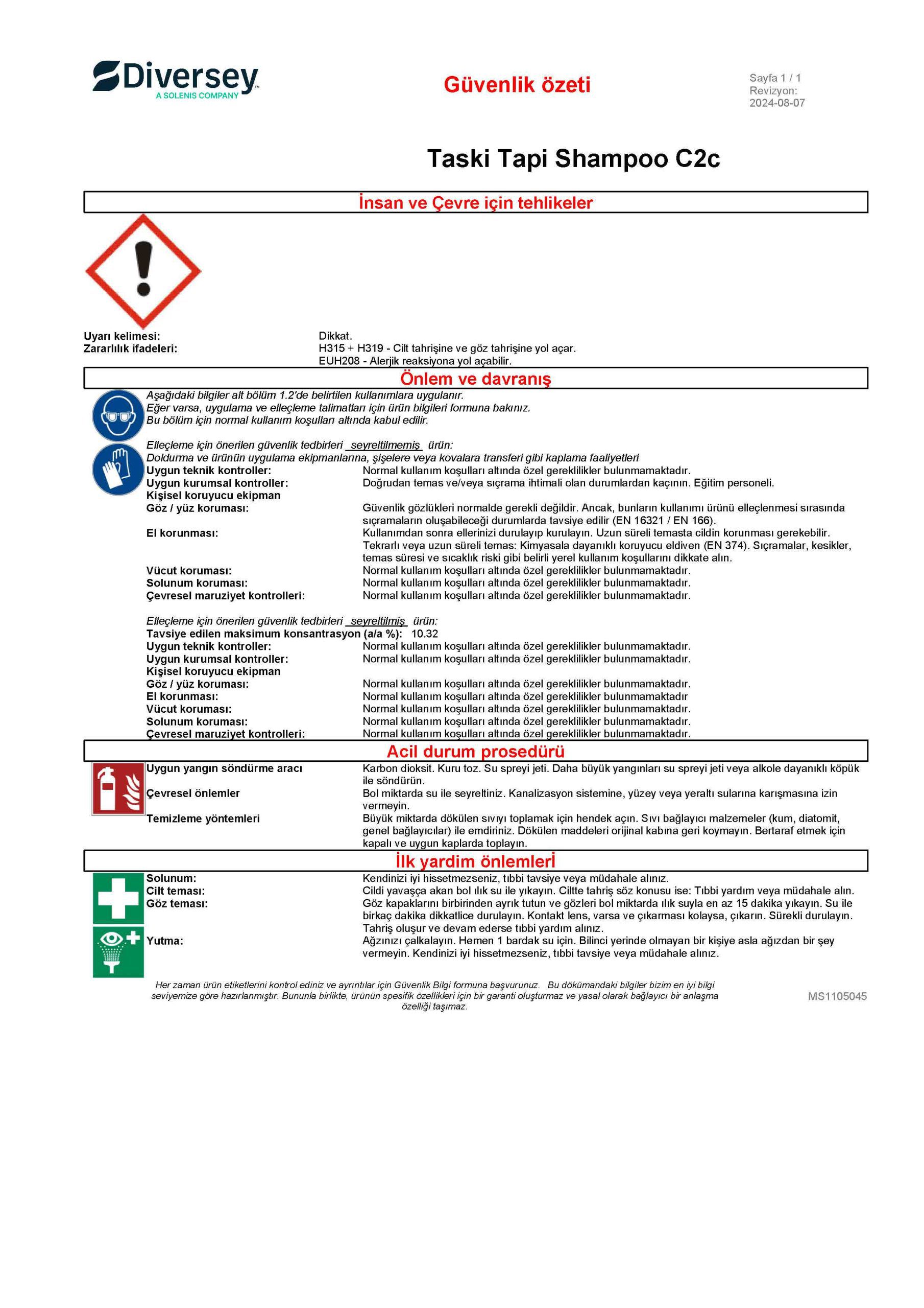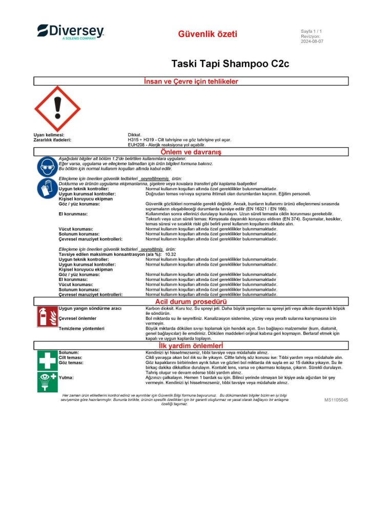 Diversey Taski Tapi Shampoo C2c Halı Yıkama Şampuanı 5 L MSDS Güvenlik Bilgi Formu ve Güvenlik Özeti