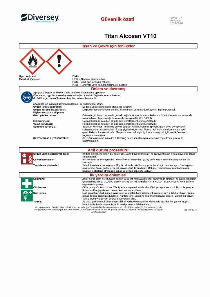 Diversey Titan Alcosan VT10 Yüzey Dezenfektanı Biyosidal Ürün 5L/ 4,8 Kg MSDS Güvenlik Bilgi Formu ve Güvenlik Özeti